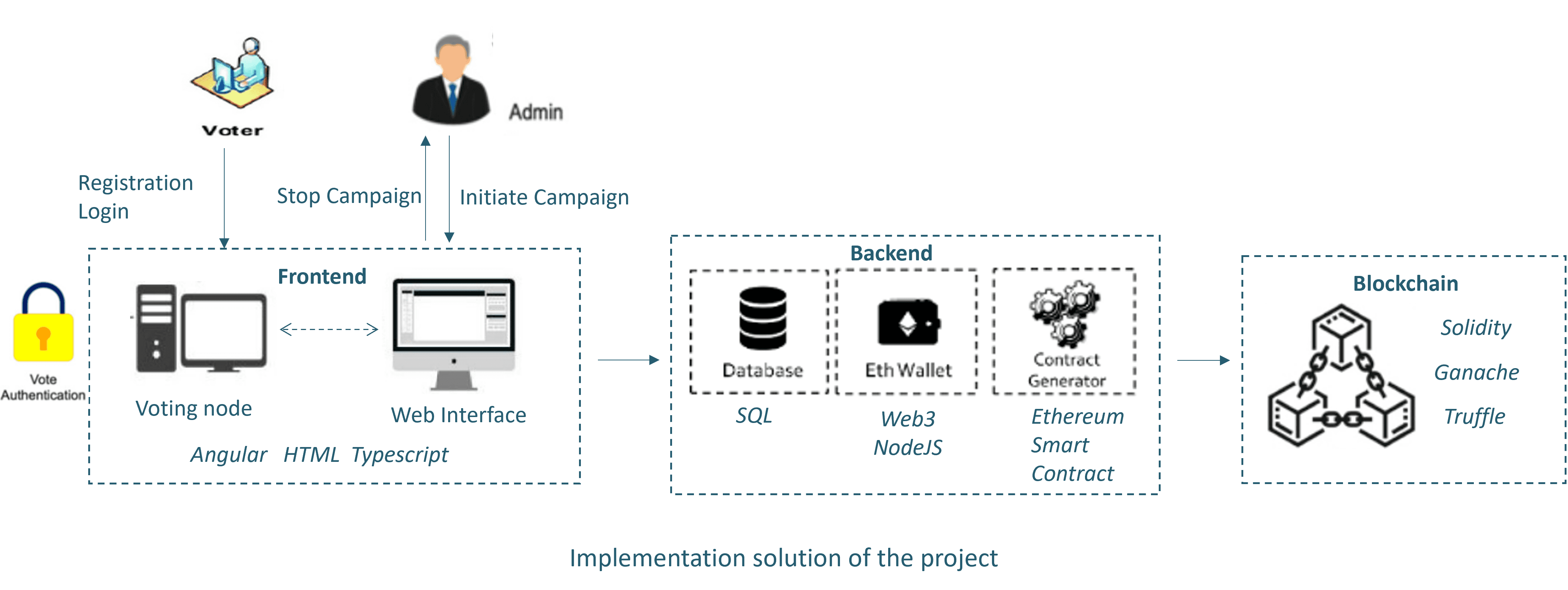 Within this project, the goal is to implement a decentralized, high-availability voting system using smart contracts on a private Ethereum blockchain. The system should be able to authenticate users, register them for voting on the network, handle the actual voting process and finally provide the results to an administrator. Each voting session has to be initiated by an administrator, who registers the election candidates in the system and also sets the duration of the election campaign. The system needs to be set up as a Web app that has two frontends: one for the voters and one for the administrator.