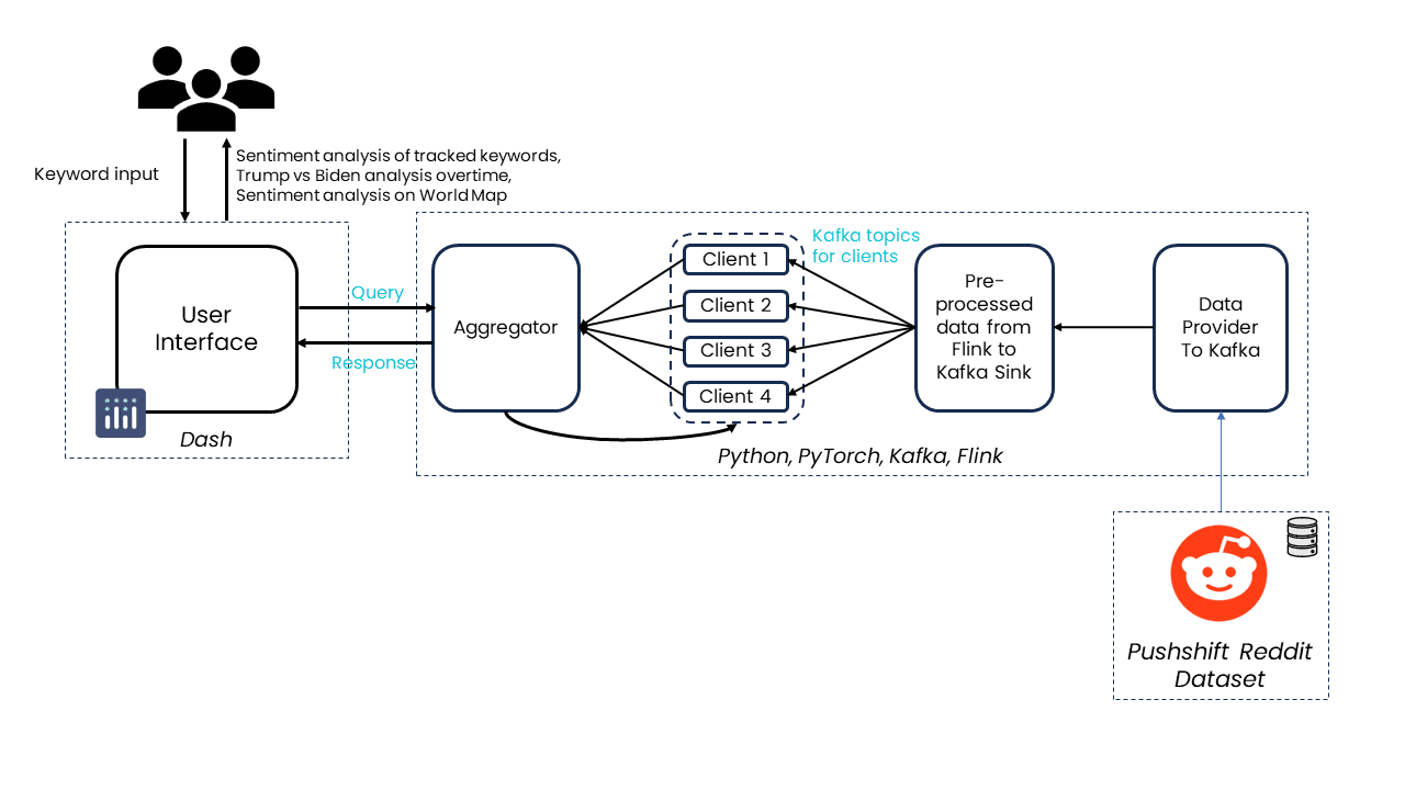 I used the Pushshift Reddit Dataset, specifically focusing on comments from April 2019. This dataset is huge with 165 GB, so I only used a portion of it between April 1, 2019 to April 17, 2019 to make our project manageable. Apache Kafka was used to manage the data stream, feeding it into Apache Flink for processing. The sentiment analysis models were trained using PyTorch.